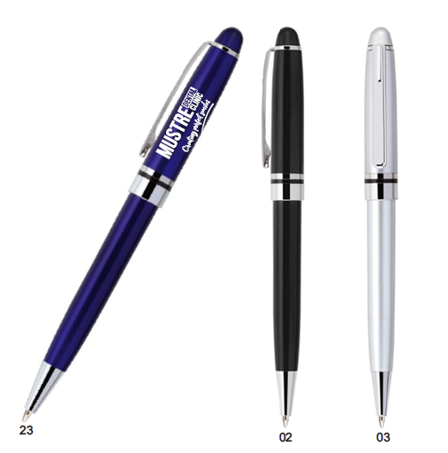 Bolígrafo plástico con acabado metalizado, anillo y punta metálica. Mecanismo retráctil.