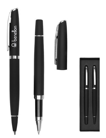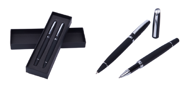 Set de bolígrafos metálicos con recubrimiento de goma. Incluye bolígrafo tipo roller con tapa y bolígrafo con mecanismo retráctil. Detalles y clip metálicos.