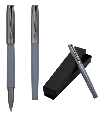 Bolígrafo metálico con tapón. Cuerpo en color gris y el tapón en color gun. Incluye estuche.
